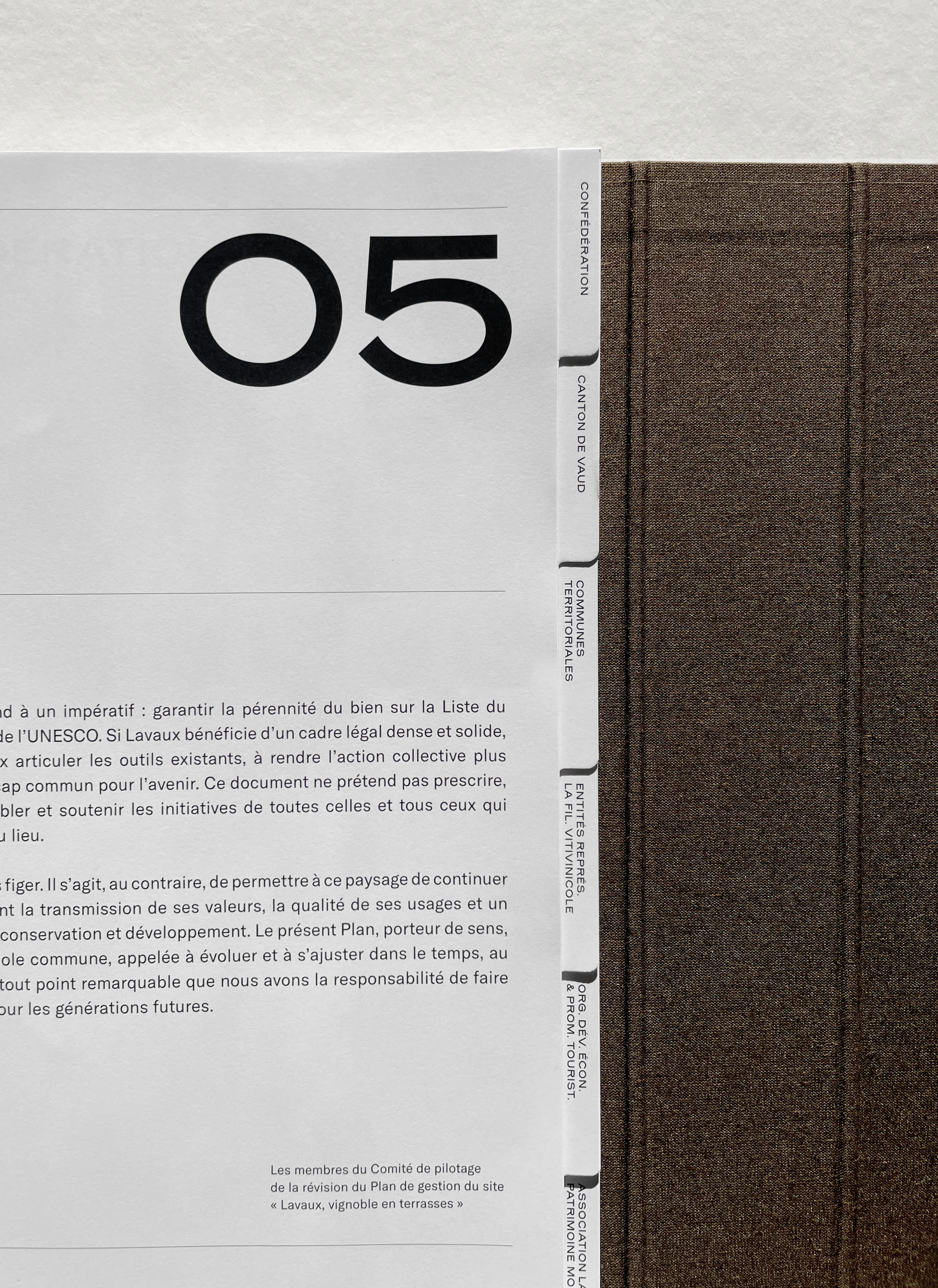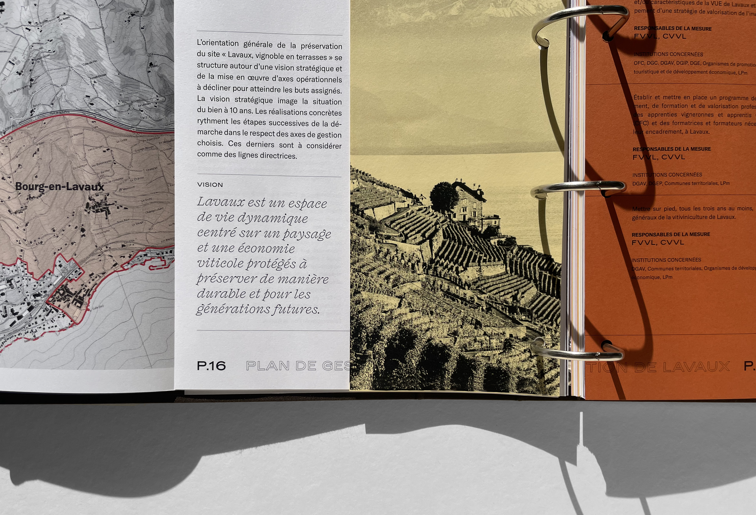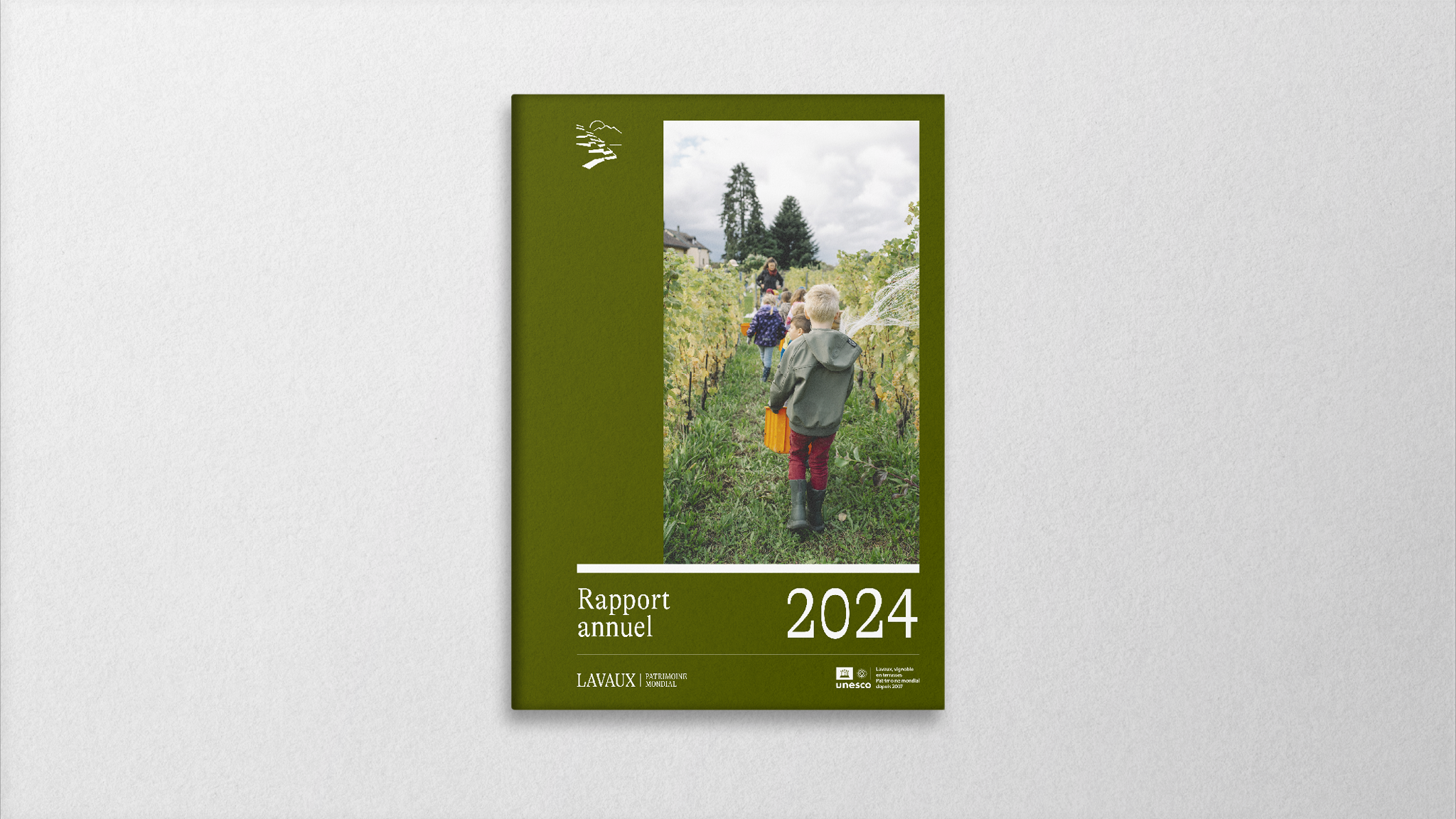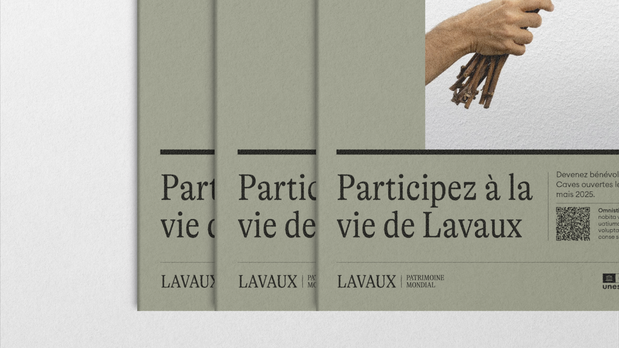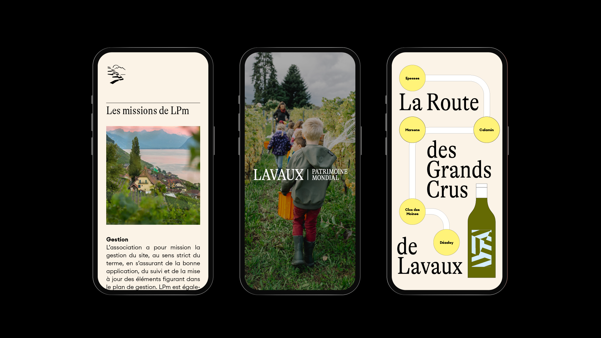 L’identité graphique, nous avons pris le parti de nous détacher de l’imagerie carte postale associée à Lavaux. Nous avons développé un système visuel clair et ordonné, ancré dans une approche suisse, où la rigueur structurelle guide la lecture. La typographie combine sérieux institutionnel et accessibilité, offrant une expression à la fois précise, accueillante et fidèle au territoire.